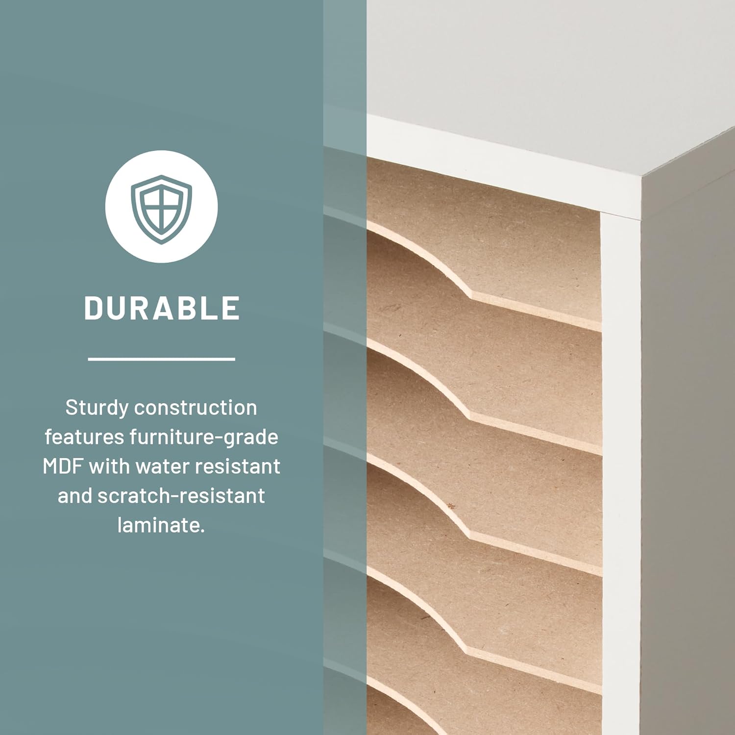 - Sturdy construction. Durable.5" thick compressed wood with hardboard shelves and solid hardboard back provide strength and stability for long-lasting performance. The durable laminate finish complements any setting. Easy assembly with pre-glued dowels