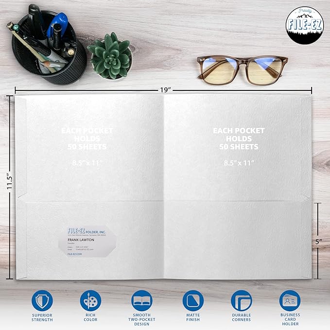- PACKAGE INCLUDES: Your selected PACK SIZE and COLOR of Two-Pocket Folders constructed using Textured Paper, Matte Finish, Supports Letter Sheet Size (8 1/2" x 11")