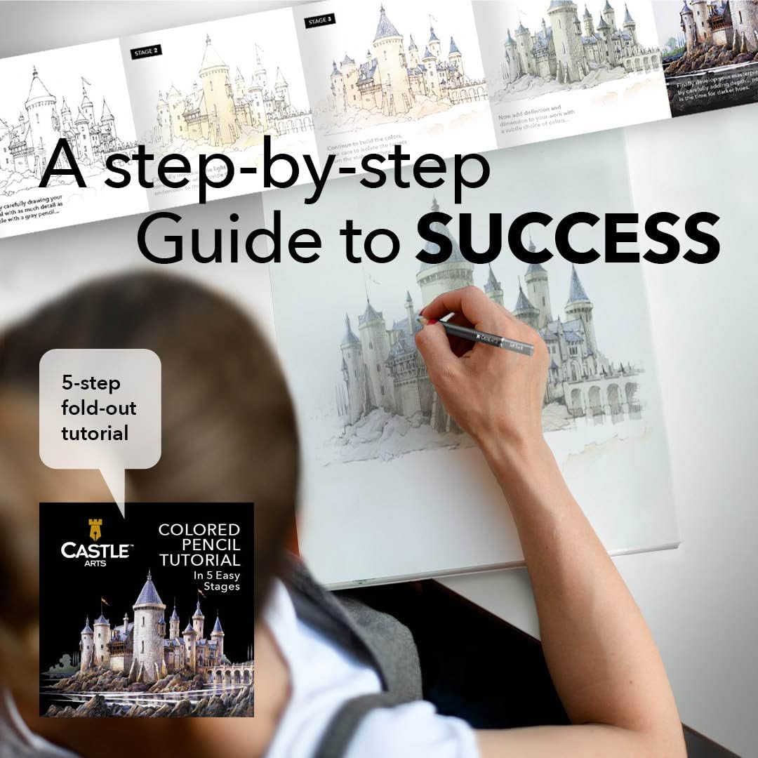 - BUILD YOUR SKILLS Unique fold-out tutorial enables you refine your colored pencil skills by re-creating the stunning Camelot illustration on the sleeve cover.