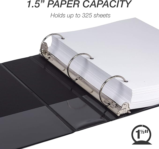 - Heavy-Duty 3-Ring Binders: Built to withstand frequent handling in classrooms, offices, and professional settings, these 1 1/2-inch durable binders securely hold up to 350 sheets of standard 8.5" x 11" paper. The robust round-ring design provides smooth page turning with reinforced hinges for long-lasting reliability. Equipped with two clear interior pockets, they’re ideal for keeping important documents, project materials, or office essentials organized and secure
