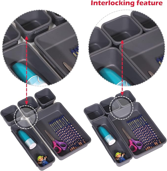 - THE EVERYTHING INTERLOCKING DRAWER ORGANIZER: No matter where you use this durable desk drawer organizers and storage — in the kitchen, bathroom, vanity makeup, or office — this multipurpose desk drawer organizer tray shallow keeps your things in order. You can freely mix and match them to increase the storage capacity in your drawers to fit a variety of home and office needs.