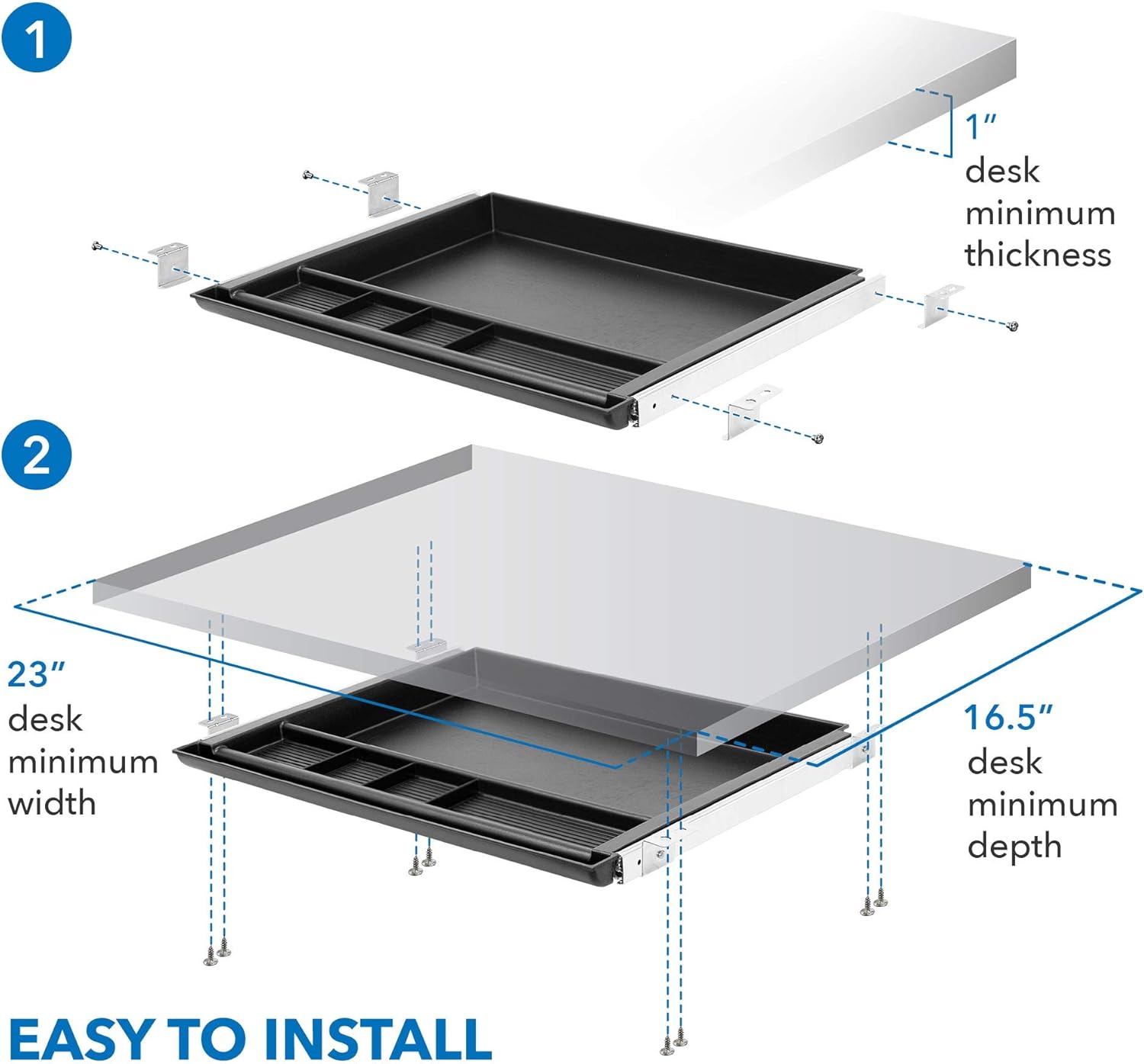 - DURABLE AND STEADY: Built with metal sliding frame and durable hardened plastic tray, this attachable desk drawer is dependable, strong, and built to last all day long.