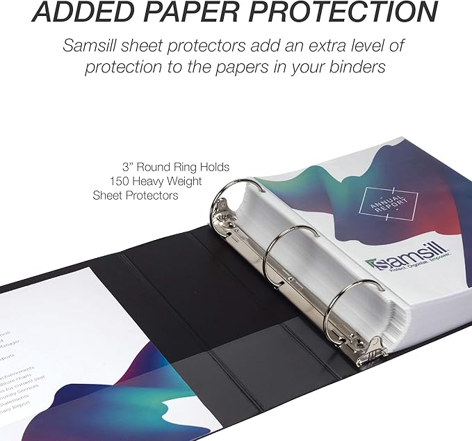 - Heavy-Duty 3-Ring Binders: Built to withstand frequent handling in classrooms, offices, and professional settings, these 2-inch durable binders securely hold up to 425 sheets of standard 8.5" x 11" paper. The robust round-ring design provides smooth page turning with reinforced hinges for long-lasting reliability. Equipped with two clear interior pockets, they’re ideal for keeping important documents, project materials, or office essentials organized and secure