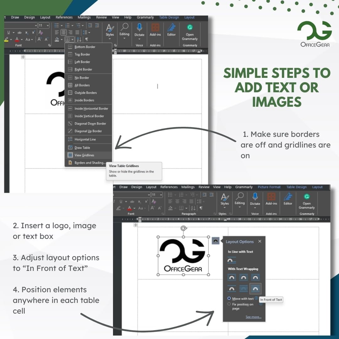 - SIMPLE INSTRUCTIONS - Use our handy pdf guide to help you with the Word template. Make sure the borders are off and the gridlines are on. Insert a logo, image and text box. Adjust layout options to "In Front of Text". Position elements anywhere in each table.