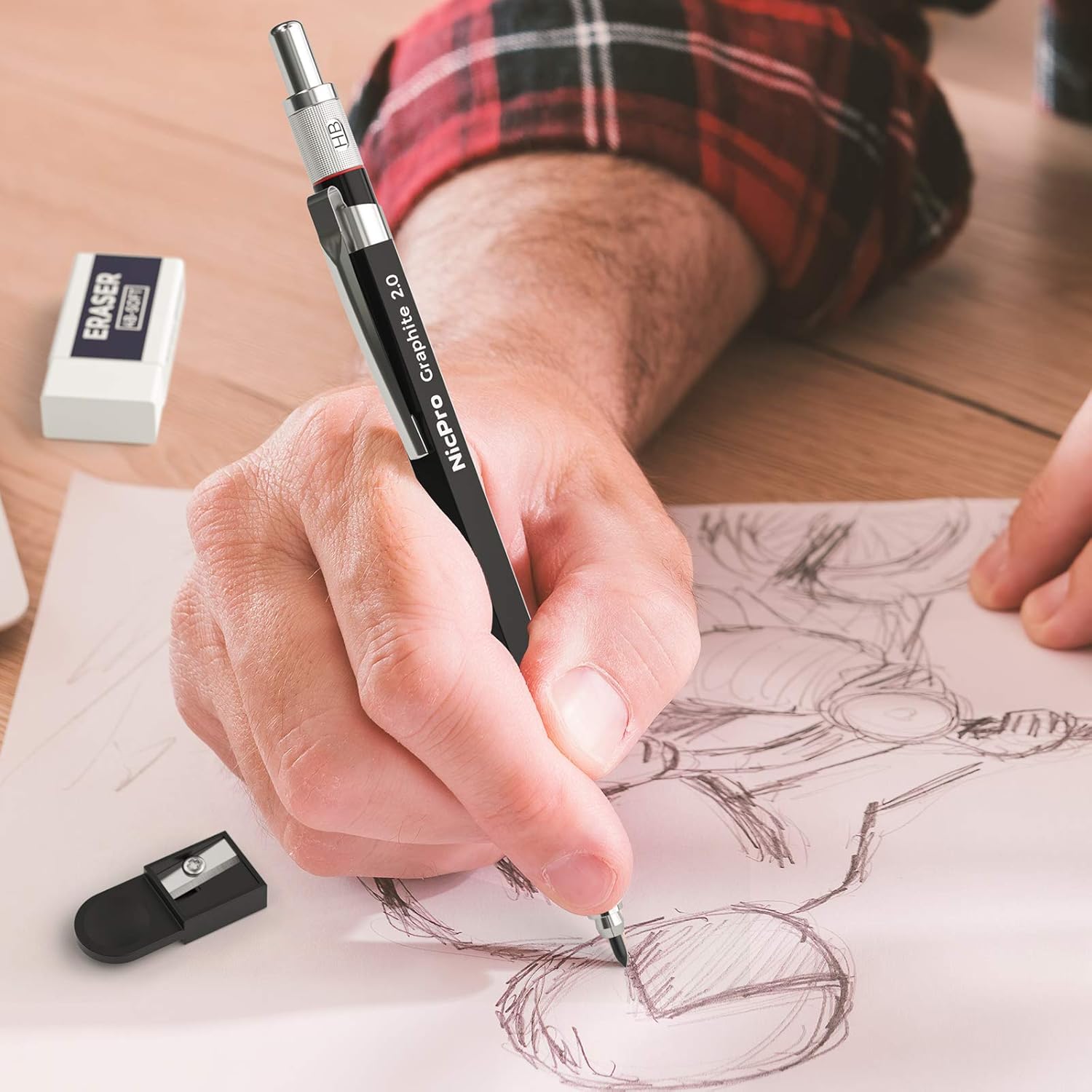 Nicpro 2.0 mm Mechanical Pencil Set, Artist Metal Lead Holder Metal Marker Carpenter pencils with 60 Graphite Lead Refill HB, 2H, 4H, 2B, 4B, Eraser, Sharpener for Draft Drawing, Writing Art Sketching