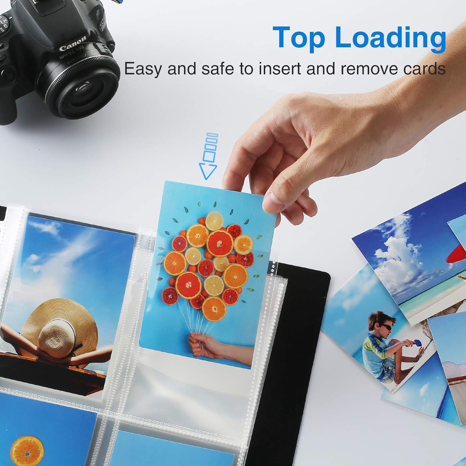 - Top Loading: Top loading style for fast and easy loading or removing photographs. Your photos and cards will remain in the page protectors without falling out.