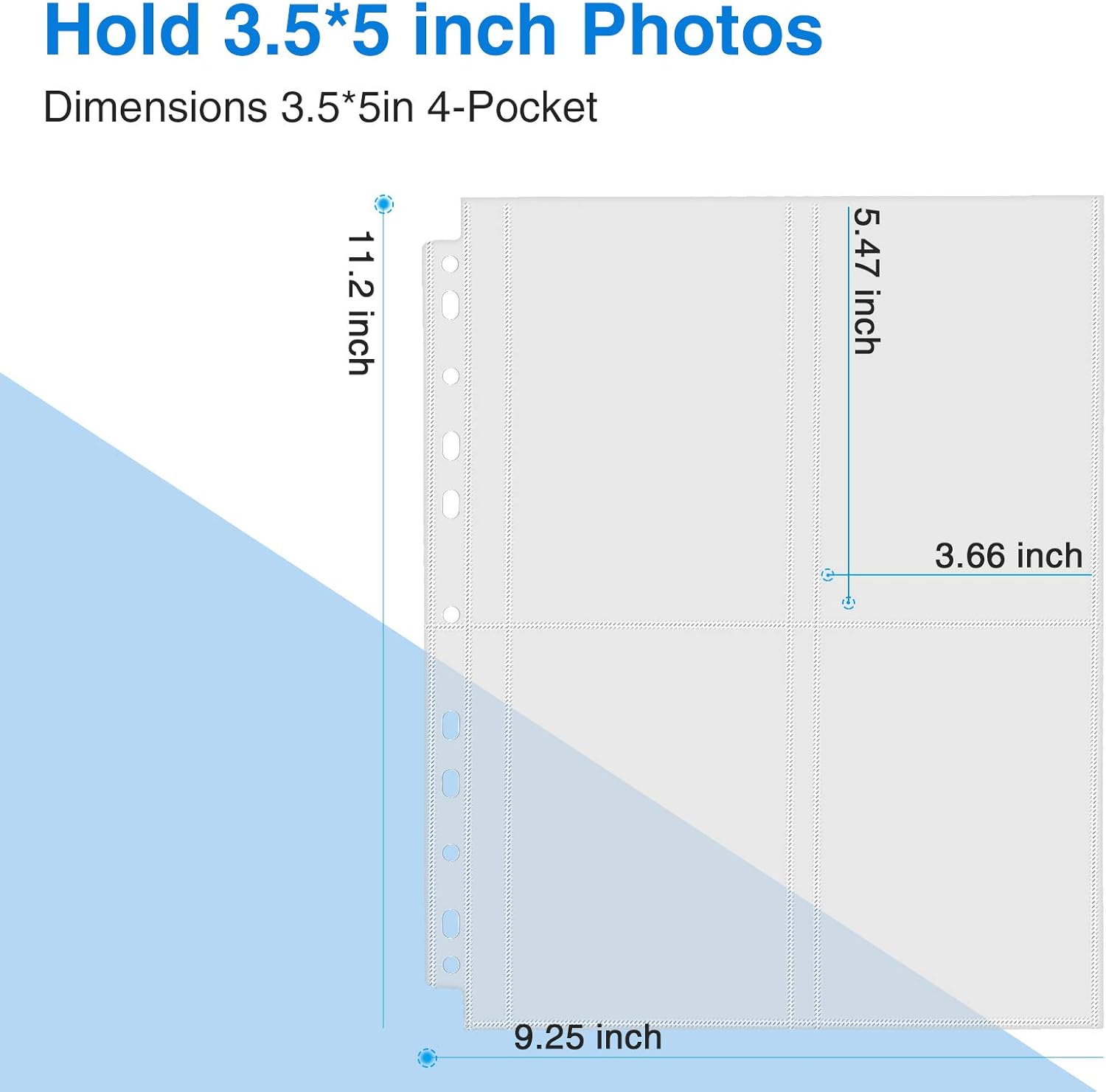 - 30 Pack Photo Sleeves: 11.2 x 9.25" photo album pages with 11-hole punched fit for 3 ring binder and other different kinds of ring binders or albums. The 3.66''x 5.47'' Pockets Perfect for 3.5''x 5'' or smaller photos or cards, 4 pockets per page, up to 8 photos with 2 inserted back-to-back, totally can hold up to 240 photos or cards.