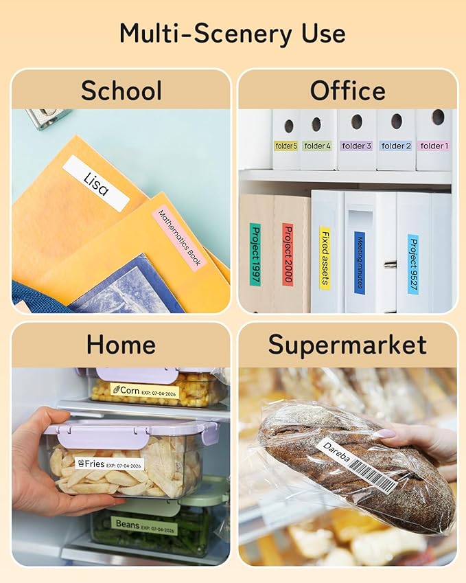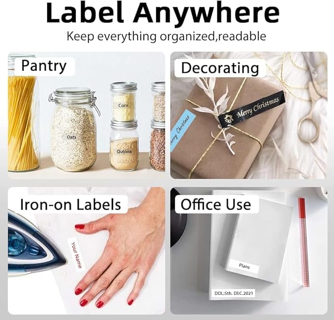- Wide Application: Small label maker is suitable for home, organization and professional field. At home, it can help you organize your kitchen, food labels, cosmetic labels, time and date labels, jewelry labels, jar labels, plant labels, clothes, for personal items; in the office, it can manage laptop labels, file sorting labels, reminder labels, and other supplies sorting and organizing; at school, it can help teachers and students to mark classroom items, personal items, and name labels, and it can also be used to label wires and cables. Ribbon label maker is a great helper for home, life and work efficiency