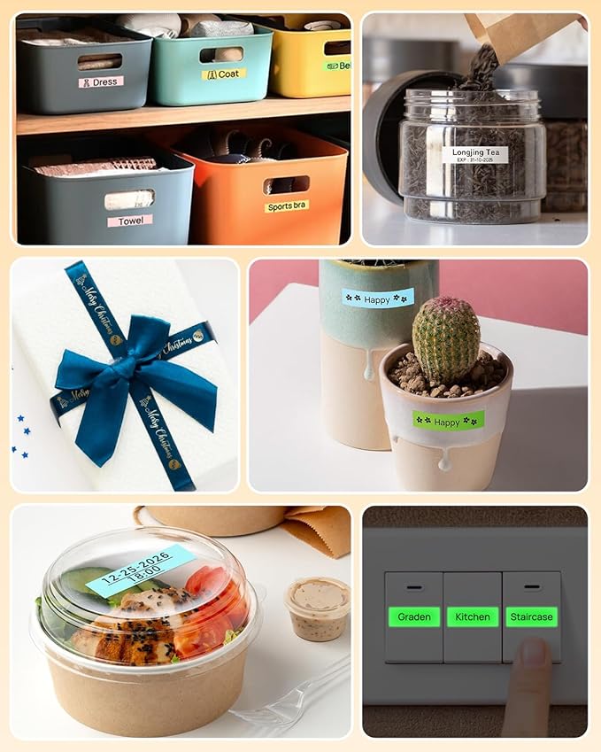 - Ideal for Home, Office and Small Business: Bluetooth label maker utilizes thermal and thermal transfer technology to enjoy high-definition printing without ink or toner. Mini label printer are BPA-free can make brightly colored paper labels, labels are waterproof, oil proof, scratch proof and tear proof, in addition to support printing on ribbon labels, customize different gift packages for your friends with different holiday designs for more uniqueness. Ideal for kitchen, party, pantry, garden, garage, tools, home and office organization. (Tip: When replacing new labels, please pull out the paper about 5 mm to avoid paper jam)