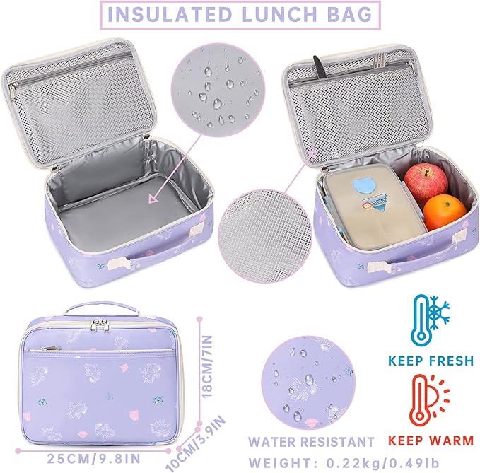 - [Dimension] - Backpack: 12.6 X 5.5X 15.7 inches, Lunch bag: 7 X 10X 4 inches, Total weight: 1.6lb. The backpack can hold books, A4 files, pens, wallet, umbrella, water bottle and other necessity.