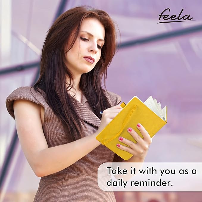 feela 24 Pack Journal Notebook for Work, Business Notebook Bulk Hardcover Lined Writing Journal with Pen Holder for Men Women Note Taking, with 24 Black Pens, 120 GSM, 5.1”x8.3”, A5, Yellow