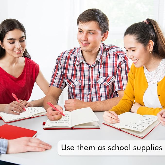 - Feela 24 Pack Classic Ruled Notebooks contains 24 classic red ruled sturdy cover notebooks and 24 Black Retractable Pens. Each of the notebooks measures 8.3” x 5.1”, which is perfect to carry and easily held by young girls and boys. These black cute pens are customized to be placed in the pen holder, which is pretty convenient.