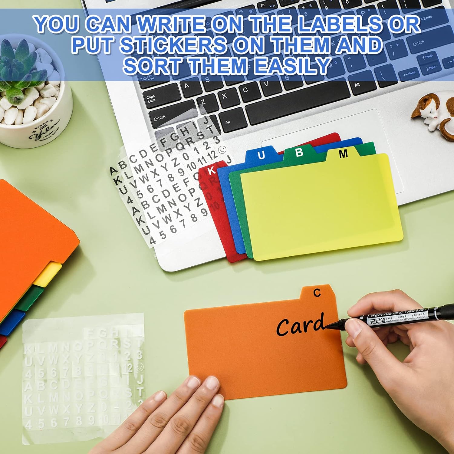 - Package Includes: you will receive 1 piece of index card box, 50 pieces index card dividers in 5 colors, 10 pieces for each color, and 2 sheets letter and number stickers; Holds approximately 500-600 index cards,sufficient quantities will meet your daily needs and you can also share them with your family members and partners