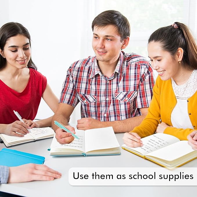 - 12 different solid colors for these notebooks. There are 12 Black Retractable Pens in the box. You can use it as soon as you receive it. These pens are perfect to be put in the pen holder of the classic ruled notebook. Large tube has the capacity of restoring more ink, which makes them long lasting. Quick drying can avoid smearing and smudge.