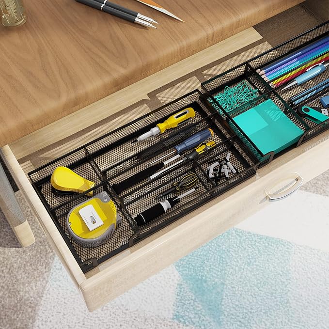 Desk Drawer Organizer, Small Metal Mesh Drawer Organizer Tray, Office Pencil Drawer Organizer Accessories for Desktop, Bathroom, Kitchen, Makeup, Vanity