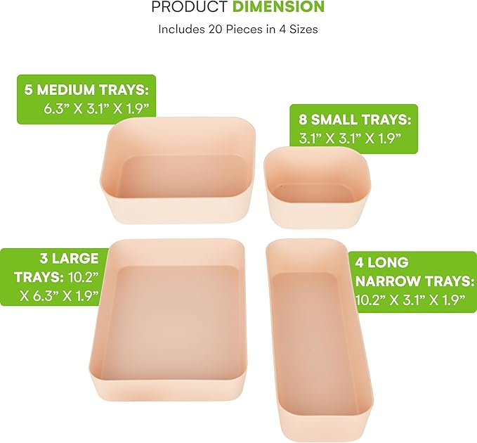 - SET OF 20: This comprehensive organizer set includes 3 large, 4 long narrow, 5 medium, and 8 small bins in assorted colors, offering flexible storage solutions for a variety of items and drawer sizes.