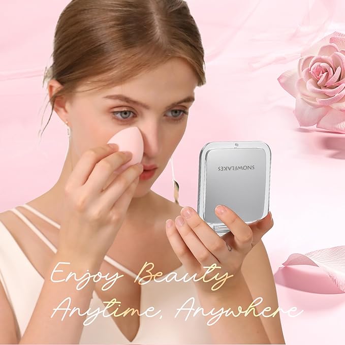 - COMPACT MIRROR - SNOWFLAKES travel mirror with magnification,one side has normal 1x magnification while the other side offers close-up and detailed 15x magnification. Clear and accurate to give you a superior image you can trust. Magnified Makeup Mirror is everything you need for mascara, lipstick, tweezing, plucking, flossing and more. Durable, attractive, convenient and easy to use.