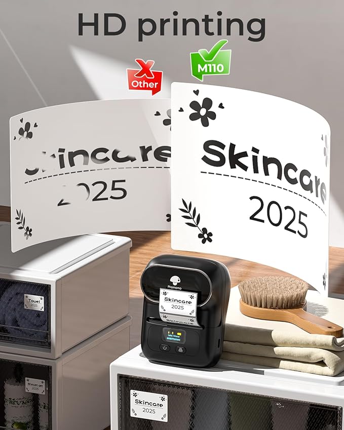 - [Powerful APP & New Technology] Download the "Print Master"app and connect flawlessly to this label maker via Bluetooth. Phomemo M110 Bluetooth thermal label maker machine with some free label templates and can set up your own templates. You can edit and typeset labels, supporting Excel batch printing to improve work efficiency. Make your business run faster. A good assistant during back to school, Halloween, Thanksgiving.