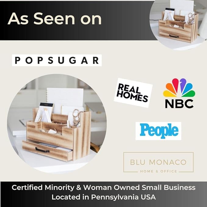 - Keep your workspace organized and clutter-free with this elegant desk organizer. Featuring a natural wood finish and a convenient drawer, it's the perfect way to stay on top of your desktop organization and office supplies desk organizer needs.