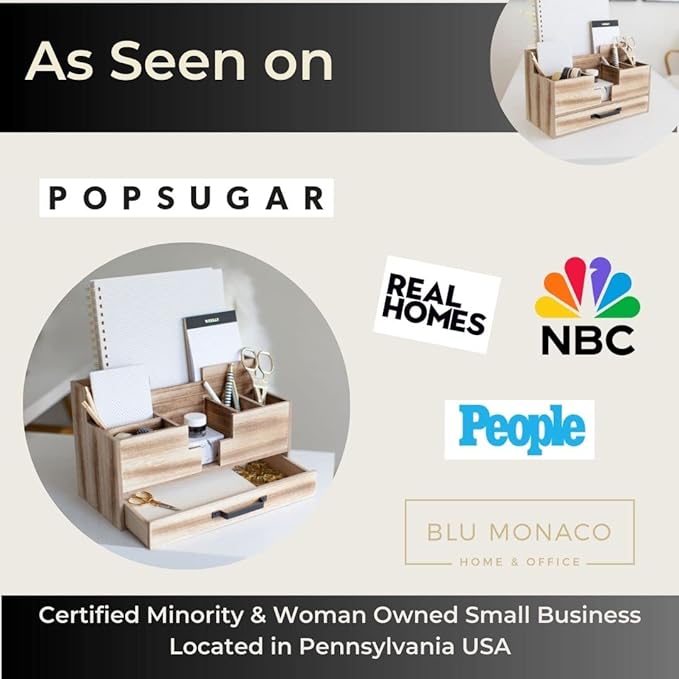 BLU MONACO Natural Wooden Office Supplies Desk Organizer with Drawer - Accessories for Women - Desktop Organization - Organization for Desk - Home Office Supplies Organizer