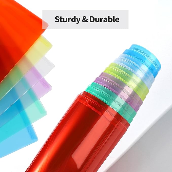 - Colorful Plastic Envelopes: Set of 20pcs, 12.8” x 9.2”, fit for A4 size/standard US letter size paper. Come in 6 assorted colors (4pcs Blue, 4pcs Red, 3pcs Yellow, 3pcs Purple, 3pcs Green, and 3pcs Transparent), eye-catching & good for sorting out messy paper.