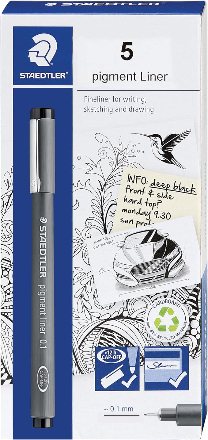 STAEDTLER Pigment Liner, Fineliner Pen for Drawing, Drafting, Journaling, 0.1mm, Black, Box of 5 Pens, 308 01-9M