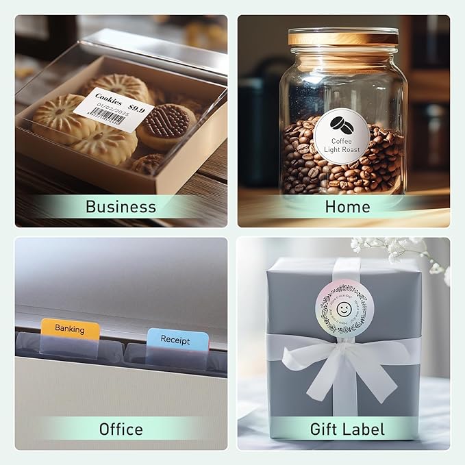 - Wide Uses: The SUPVAN T50M Plus label maker prints 3/4'' - 2'' wide labels, perfect for small businesses (price tags, barcodes, delivery addresses, etc.), home organization (spice jars, storage boxes, kitchen labels, etc.), and office uses (file folders, name tags, document classification, etc.)