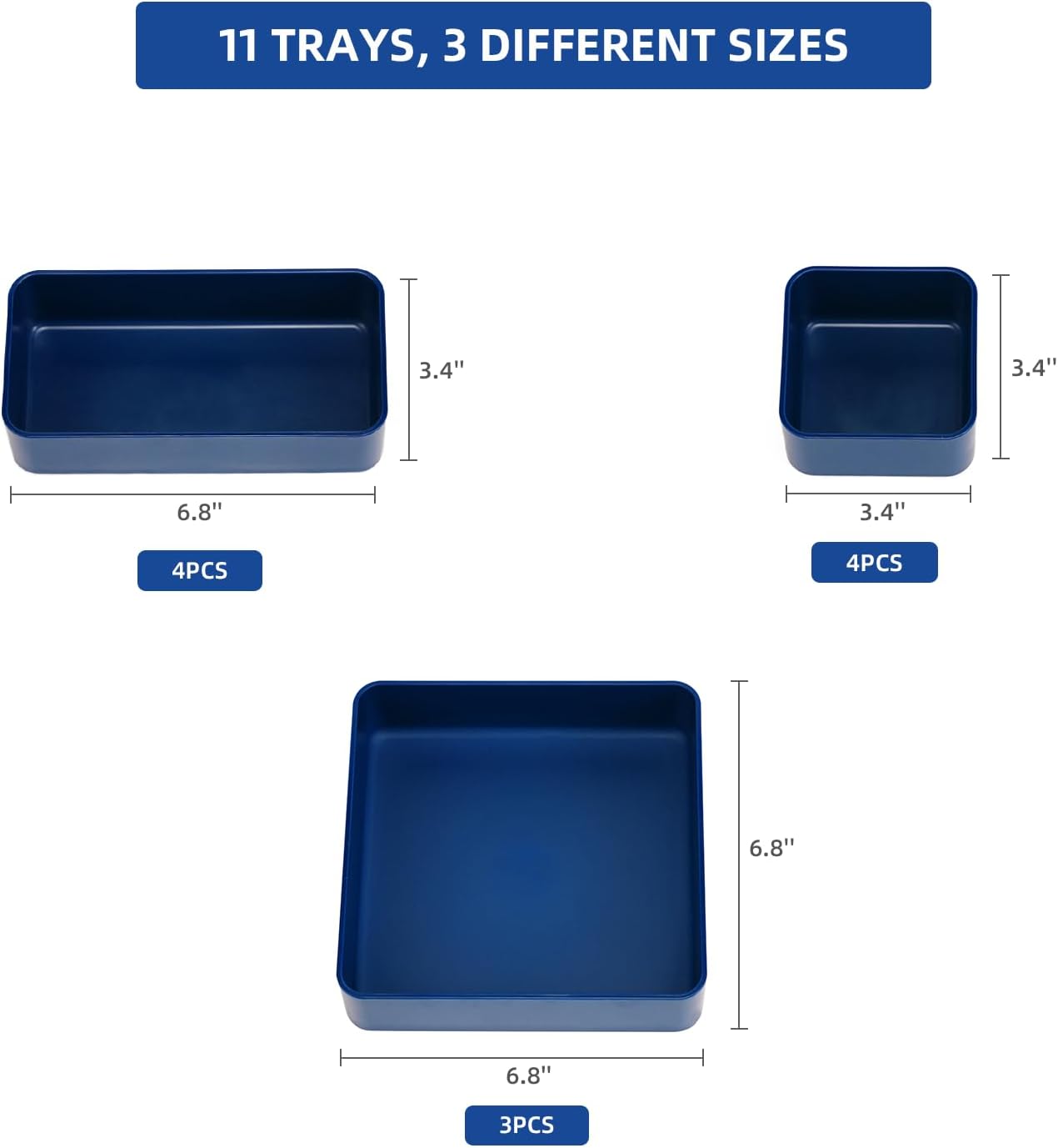 - INCLUDES: 11 stackable trays each measuring 2 inches deep. Tray measures 6.8 x 6.8 inches (3 pack), 3.4 x 6.8 inches (4 pack), 3.4 x 3.4 inches (4 pack).