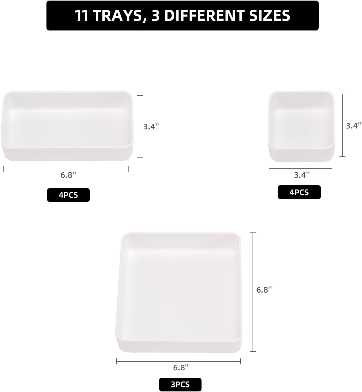 - INCLUDES: 11 stackable trays each measuring 2 inches deep. Tray measures 6.8 x 6.8 inches (3 pack), 3.4 x 6.8 inches (4 pack), 3.4 x 3.4 inches (4 pack).