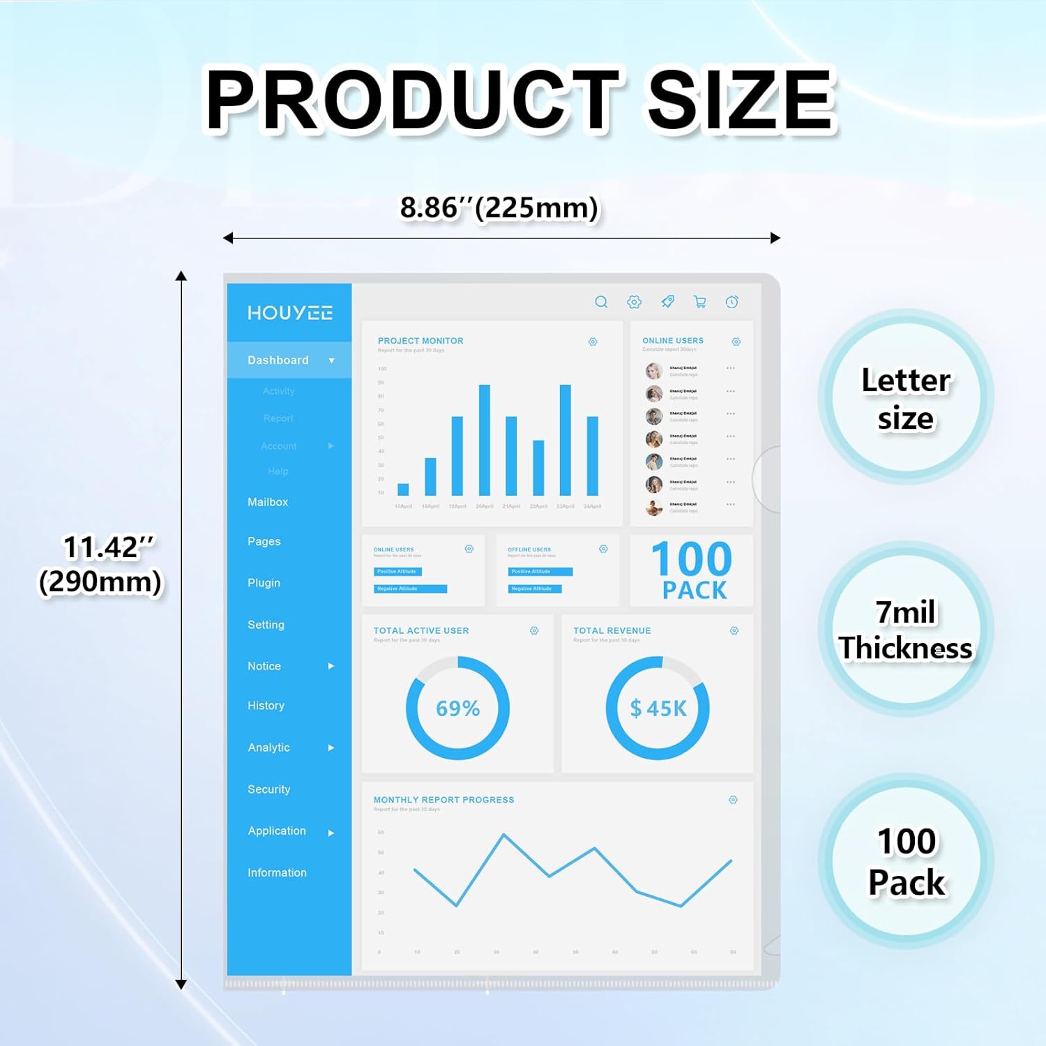 HOUYEE 100 Pack Heavy Duty Clear Document Folder, L-Type Folder Plastic Paper Sleeve Copy Safe Project Pockets Fit for Letter Size Paper, for Home, Office, and School Use