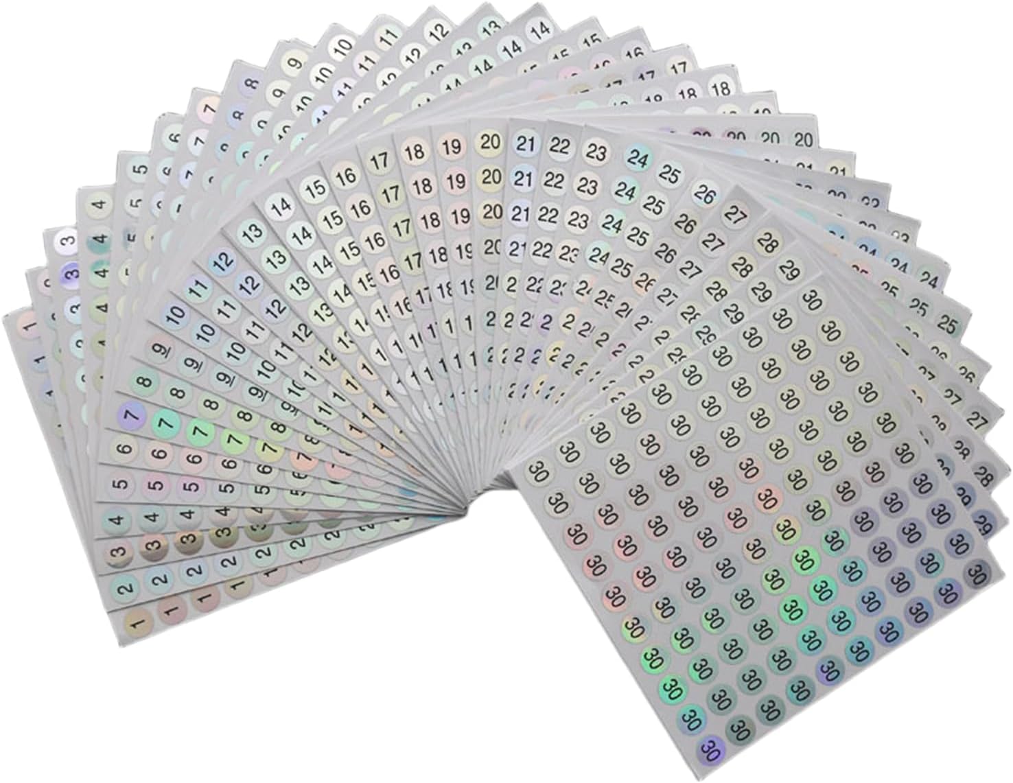 30 Sheets 1 to 30 Waterproof Reflective Laser Number Stickers,Round Self Adhesive Stickers/Inventory/Storage Organizing Sticker