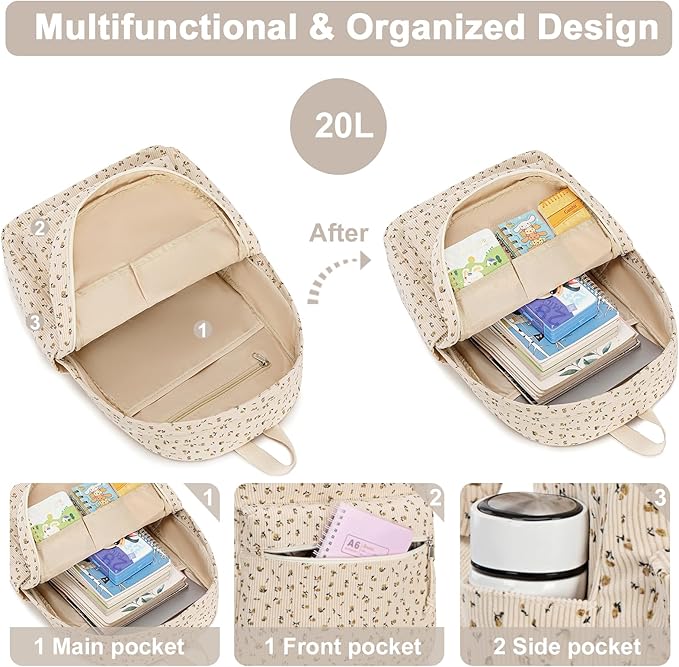 - Multiple pockets and compartments.This floral beige school girls backpack has a roomy main pockets, which can carry all of your textbooks, lunch, binders anything you may need,especially the compartment for large laptop. The front pocket can put your pens, keys, and wallets.The two side pockets can put a water bottle,selfie sticks,flashlights or umbrella.It’s easy to keep everything organized with so many pockets in it.