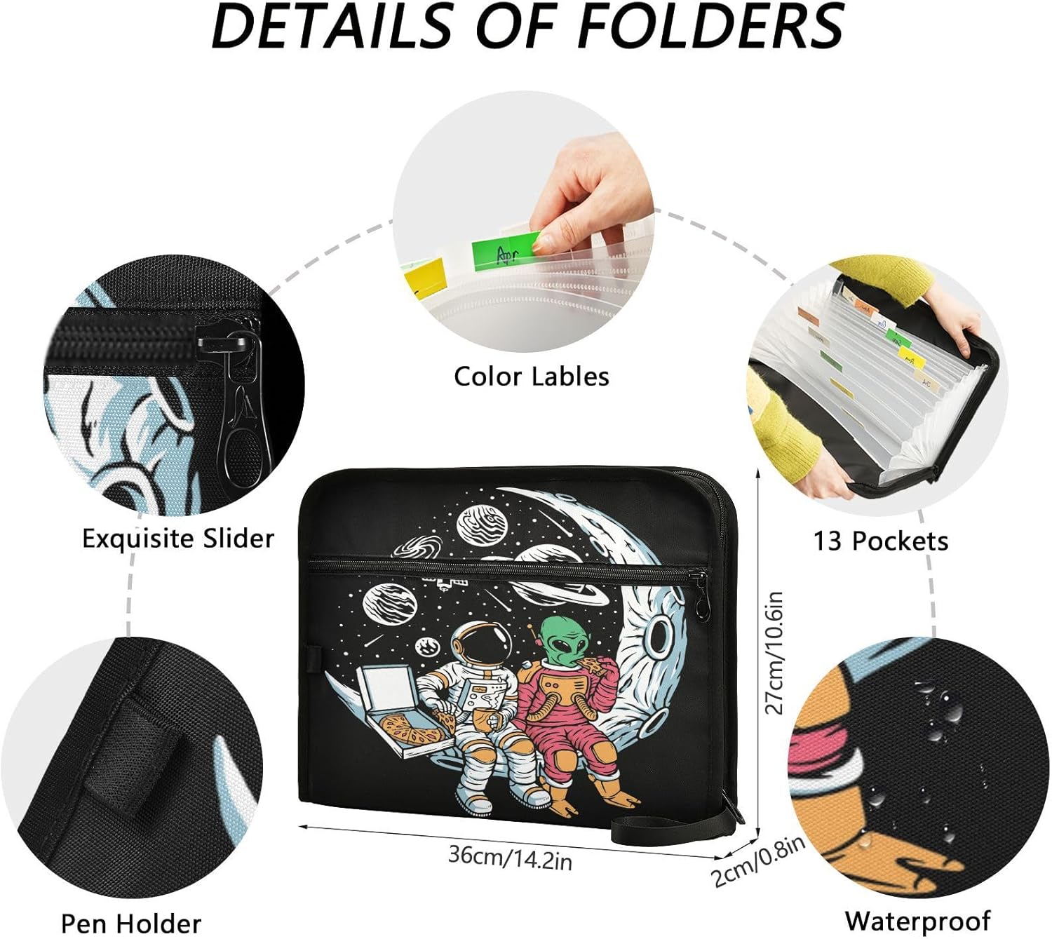 Gredecor 13 Pockets File Folder Organizer A4/Letter Water Resistant Astronauts and Aliens Moon Document Bag with Zipper Filing Folder Expanding File Pouch Storage for School Office