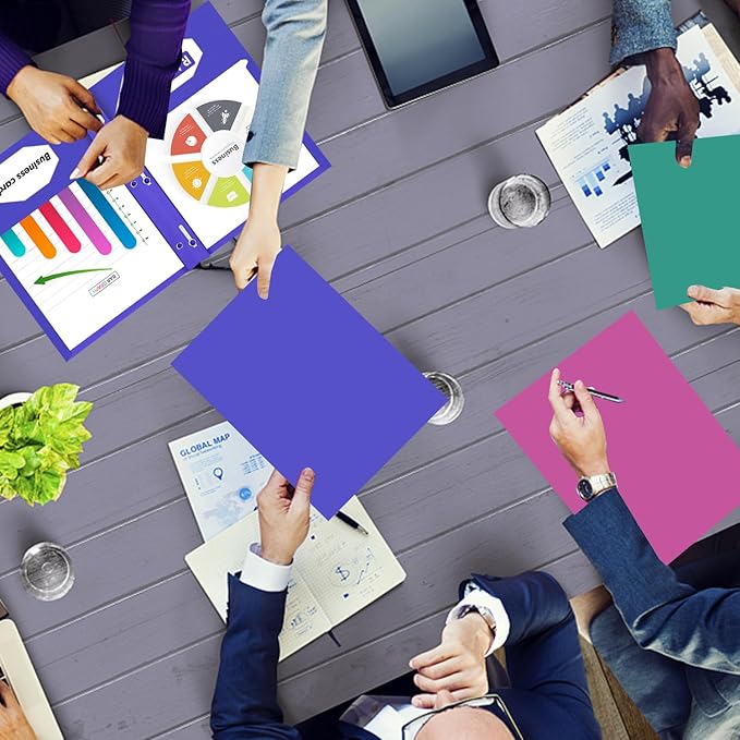 - TWO POCKET FOLDER SET: RAZCC paper file folders with 2 inner pocket, 3 prongs and 2 business card slots. 50 Pack in off - Navy blue, grey, purple, turquoise and rose purple, color-code your notes or documents in these specific colors to keep them organized by subject or project