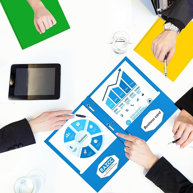 - TWO POCKET FOLDER SET: RAZCC paper file folders with 2 inner pocket, 3 prongs and 2 business card slots. 50 Pack in off - green, cyan, orange, yellow and magenta, color-code your notes or documents in these specific colors to keep them organized by subject or project