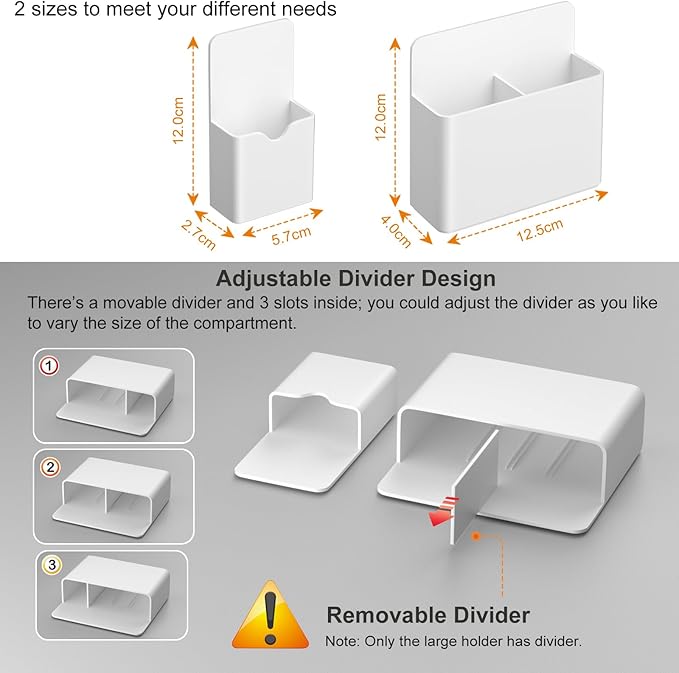 - 【Adjustable Divider Design】- Each whiteboard marker holder has a removable divider and 3 slots inside, you can adjust the compartment size by moving the division ,which can effectively prevent the markers and eraser from constantly slipping to the bottom, also you can take it out entirely if you want to fit more in it. It'll be nice to get your pens off the top of your fridge and down where you can get to them easily. (Only the large holder with removable block).