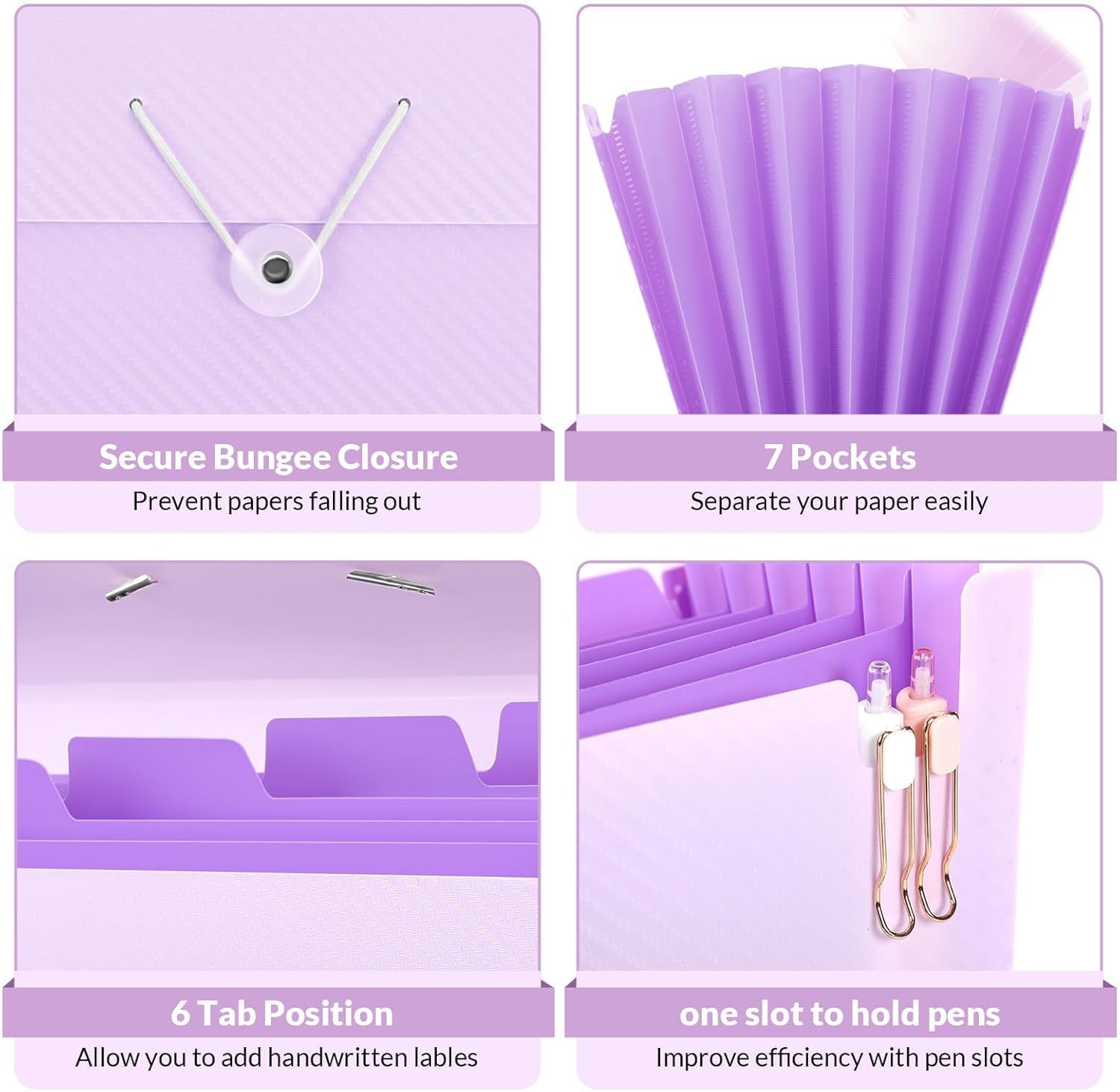 SKYDUE Expanding File Folder with 7 Pockets, Accordion File Organizer, Portable Folders for Documents, School Office Supplies Bungee Closure, Letter/A4 Size Purple
