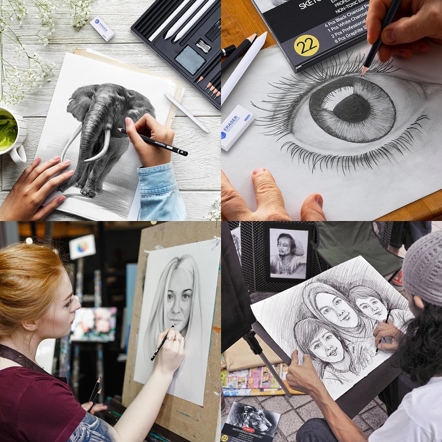 - PRO SKETCH PENCILS DRAWING SET - 22 Pack Art Pencil Set Include 8 Graphite Sketching Pencils(12B 10B 8B 6B 4B 2B HB 2H), 4 Black Charcoal Pencils(S-Soft Soft Medium Hard), 1 White Charcoal Pencils, 3 Charcoal Sticks, 3 Blending Stumps, 1 Sharpener, 1 Kneaded Eraser and 1 Vinyl Eraser, This professional sketch Pencils drawing set will give a fuller expression of your work.
