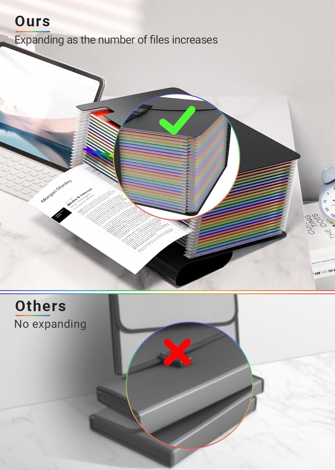 - ✔【SAFE MATERIALS】Expandable file folder are made by high quality polypropylene and polyester, 20% and more thicker than other file folders, it can stand on the desktop independently, no easy to be broken and deformed. 100% Waterproof, Non toxic, Non Odor, Anti-wear, tear and Moisture resistant.