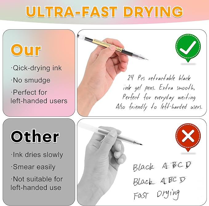 - Fine Writing Experience:This set of 24 bulk, 0.35 mm thin lined black gel pens with ultra fine point pen offers smooth writing, similar to premium rollerball pens. Ideal for bullet journaling, art projects, and office/school note taking, great for calligraphy lovers and journaling enthusiasts, ensuring neat lines.