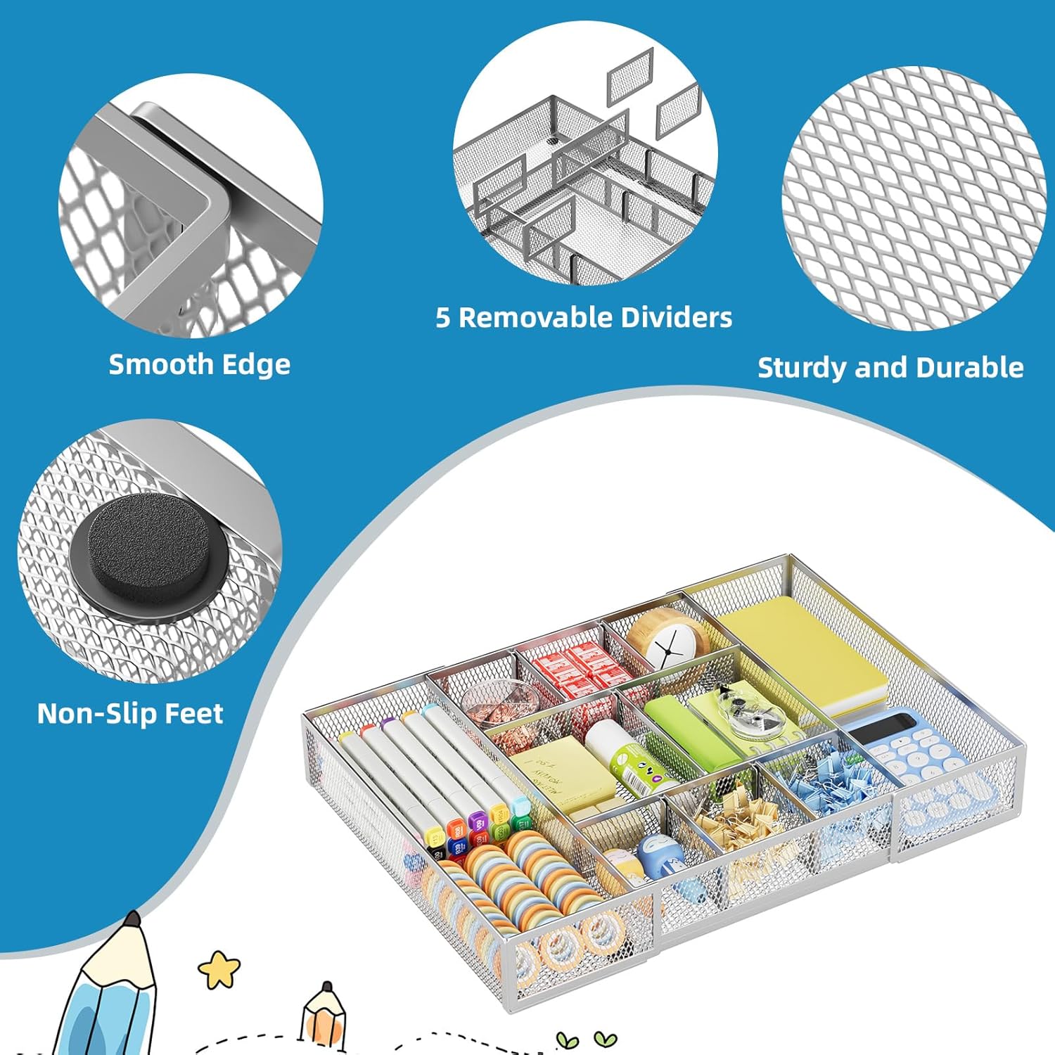 - 【Adjustable Dividers】: Our drawer organizer features 4+1 removable dividers. You would configure the size for fit varisized desk accessories, such as pens, erasers, highlighters, notes, staplers, tapes, clips