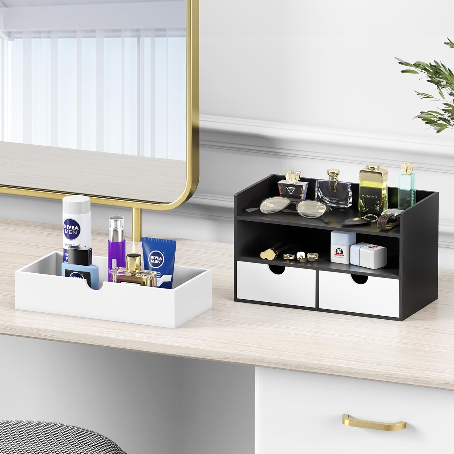 Wisuce Desk Organizer with Drawers - Bamboo Desktop Organizer Storage | Black-White Wood Desk Makeup Dresser Top Organizer for Cosmetics No Assembly Required