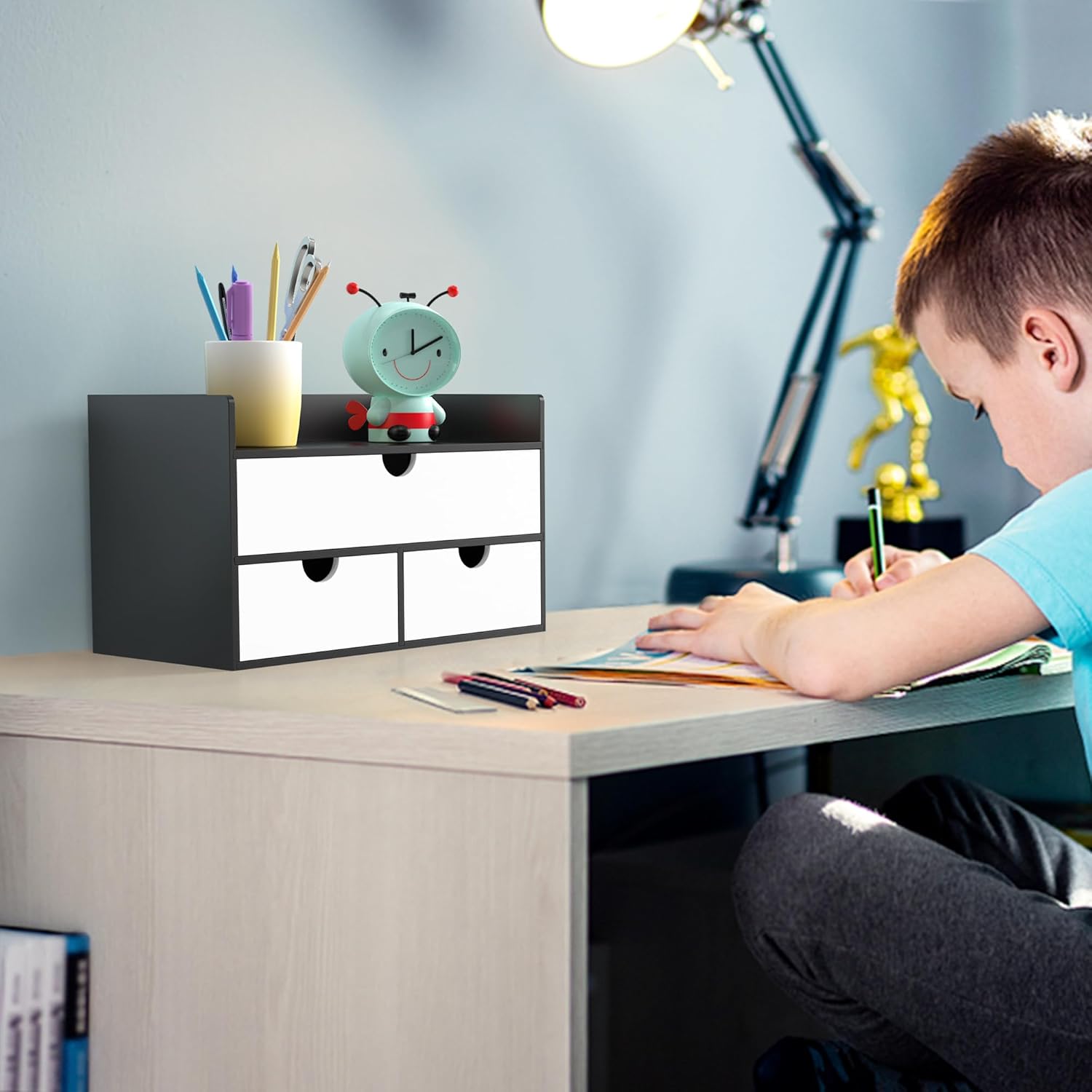 - 【OPTIMIZE YOUR SPACE】The desktop organizer with drawers can store all kinds of documents, tools, accessories, and bills on your desk. You can put this desktop organization in the office, study, dresser, bathroom, countertop, etc