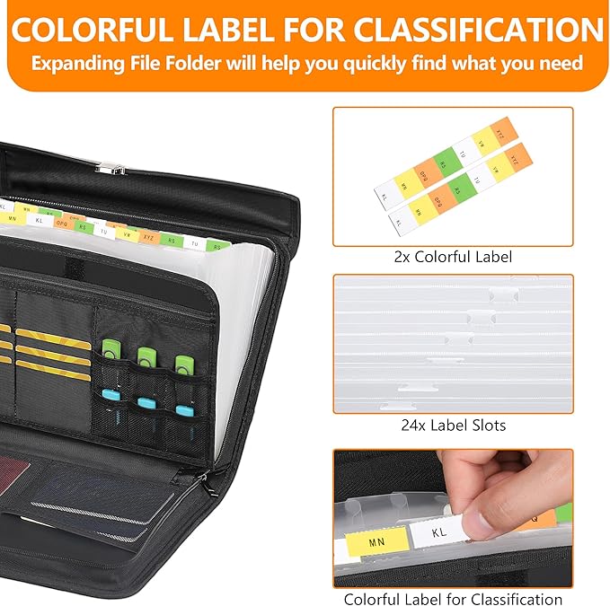- COLORFUL LABELS for CLASSIFOCATION: With vibrant labels,fireproof accordion file organizer helps you effortlessly categorize your documents and retrieve them in an instant. Whether you're managing work projects, personal finance, or important documents, our color-coded system simplifies your workflow. No more wasting precious time searching through stacks of papers –document folder organizer ensures that every file is easily identifiable