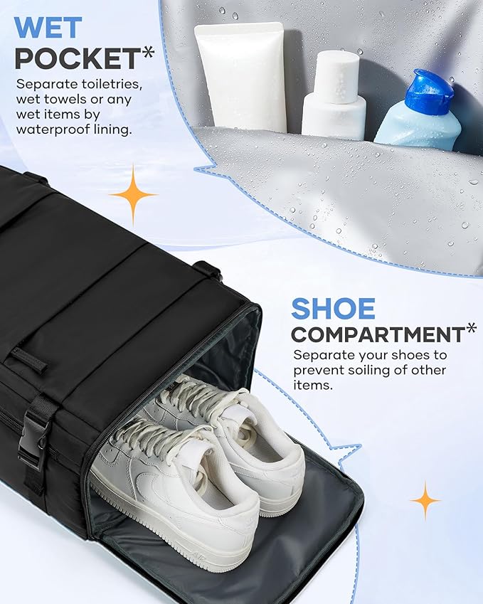 - 【Multi-Pocket Function】This backpacks for travel has a special shoe compartment for shoes, which can hold sneakers (Hint: only one pair) and can accompany you out anywhere. This backpack for travel has 2 front pockets for tablet, cell phone, rechargeable keys and other small items; and 1 cup pockets for umbrella or cup