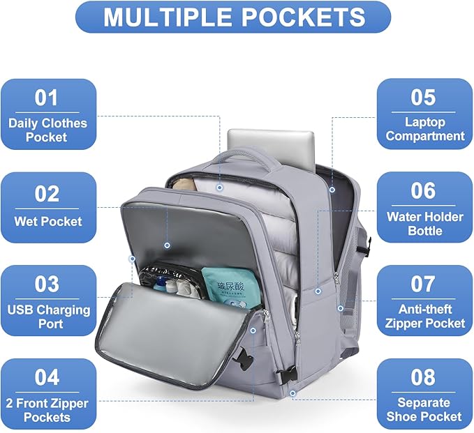 Grey Travel Backpack - Carry On Flight Approved Mochila De Viaje Personal Item - Large Backpack for Men & Women - 18x14x8 Inches