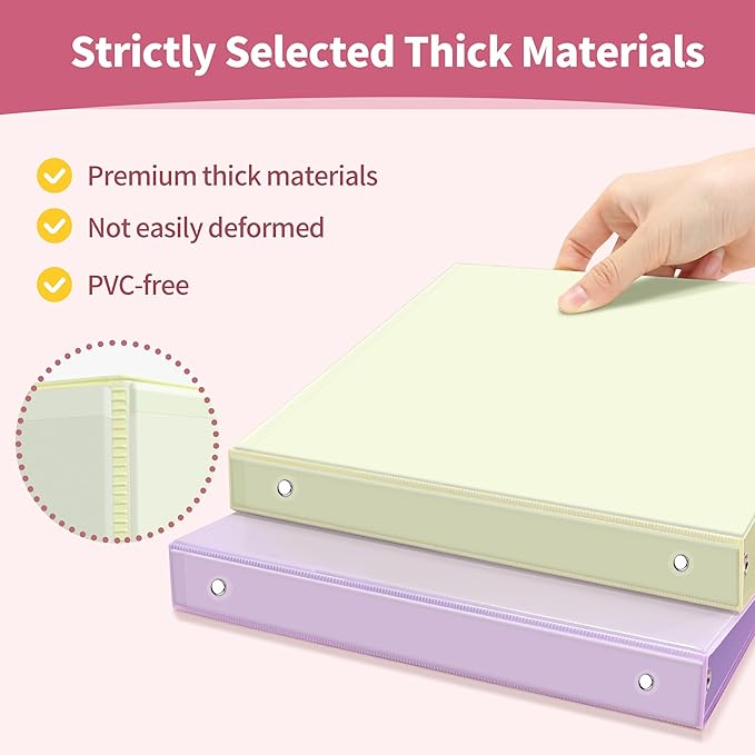 - LONG-TERM PRESERVATION: The 1/2 inch binder 3 ring is made of sturdy material and is moisture and dust resistant. This 0.5 inch binder is PVC-free and non-stick. The color will always remain without fading during use. The durable rounded edges have a corner grinding process, which effectively prevents wear and tear