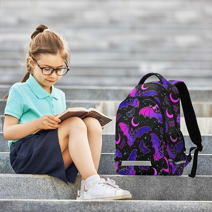 Bat Backpack for Students Boys Girls Purple Bat Gothic School Bag Travel Daypack Rucksack