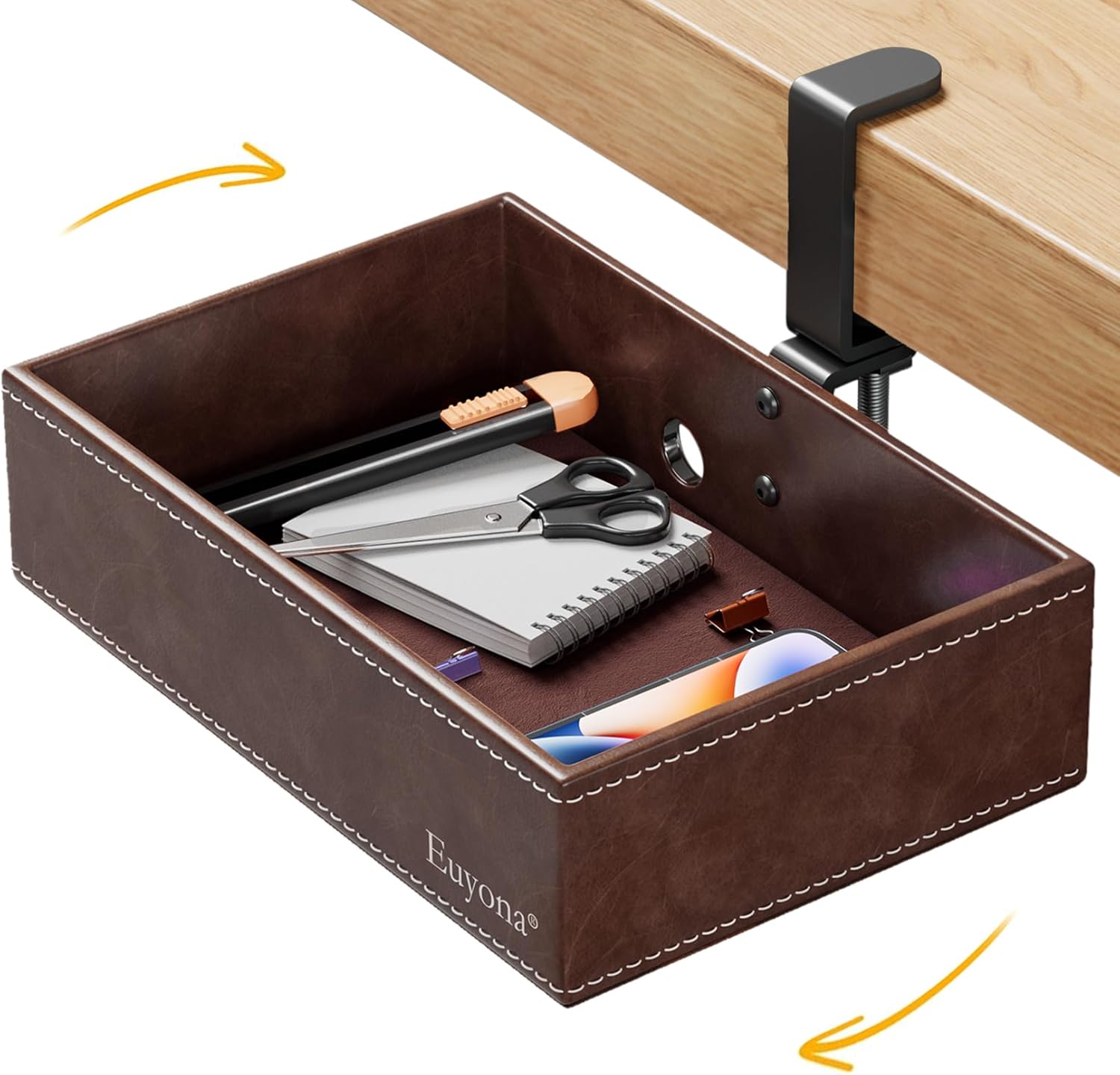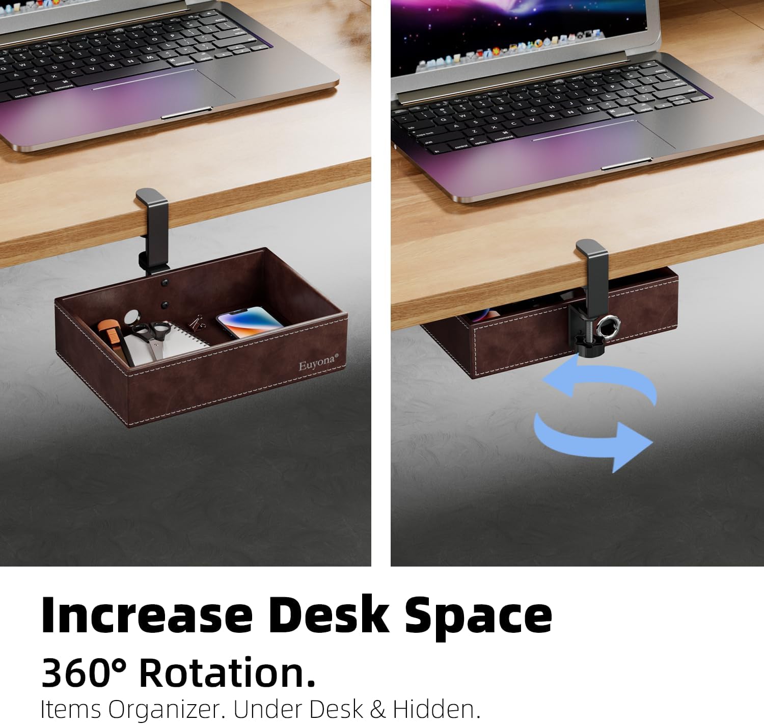 Mesh Hidden Desk Organizer with Swivel Drawer, Heavy-Duty C-Clamp Mount for Office Supplies, Art Tools & Pencil Storage – Easy Install Desktop Accessories (Coffee)