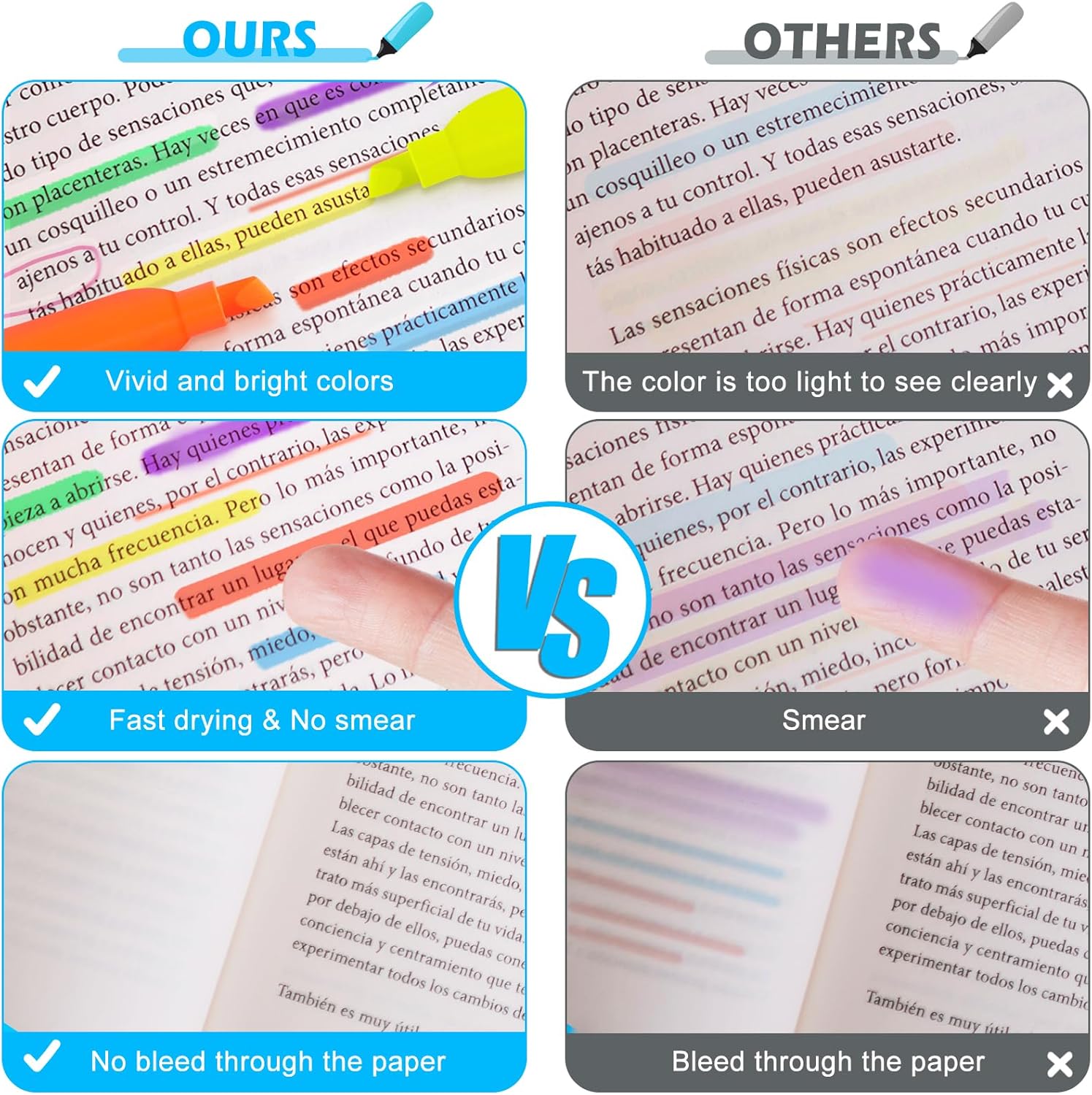- Non-bleed & Quick-Drying: Highlighter markers use quick-drying ink, making highlighted marks clearly visible without worrying about the ink staining your hands and your book. Even if you highlight on one side of the page, the other side is still completely readable, and there's no need to worry about ink bleeding through and affecting the readability of the page.